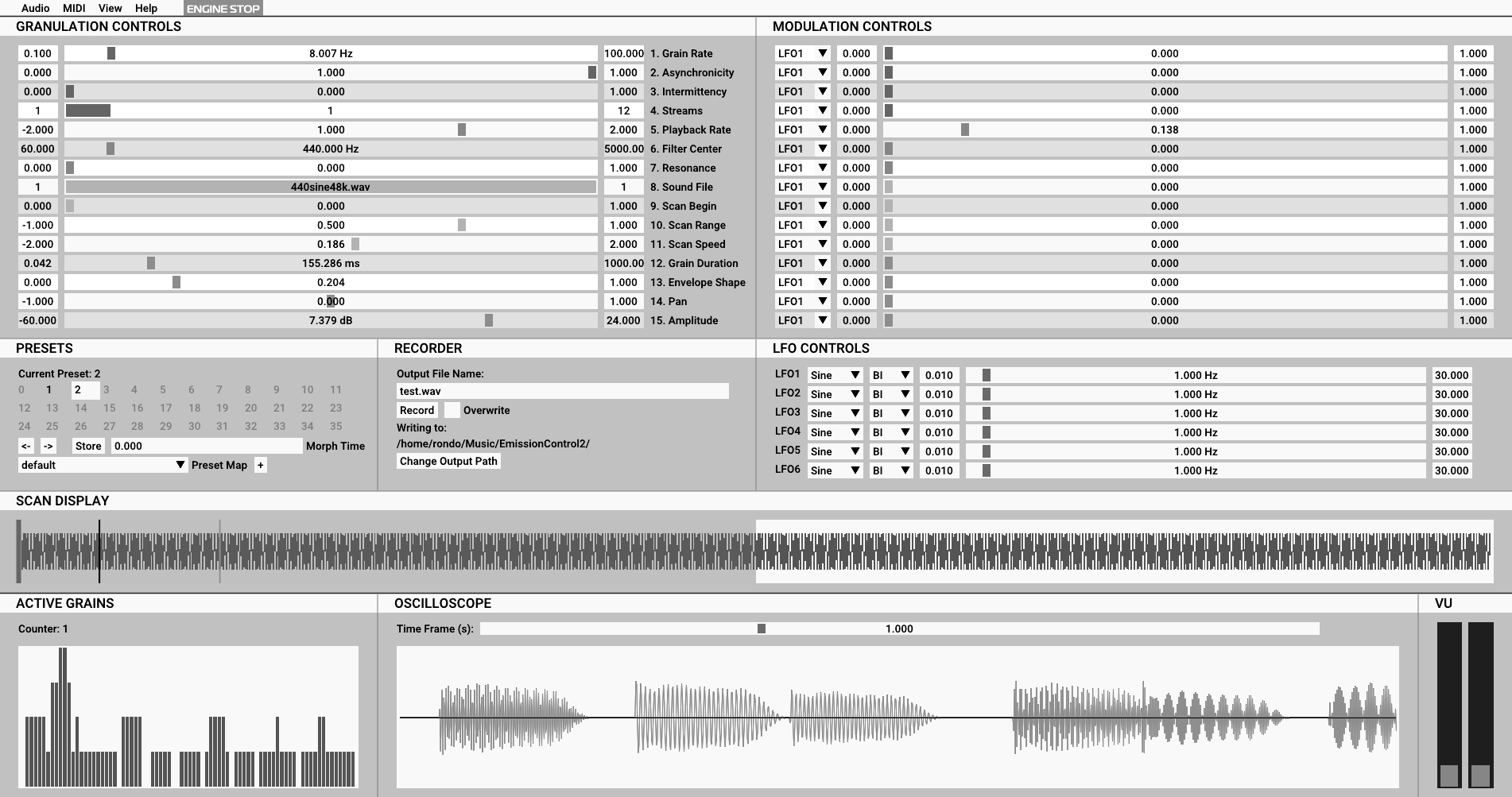 Raphael Radna and I are working on a new granulator plugin that is easier to use than EmissionControl2. In addition, it responds to MIDI note messages and supports microtonal scales.